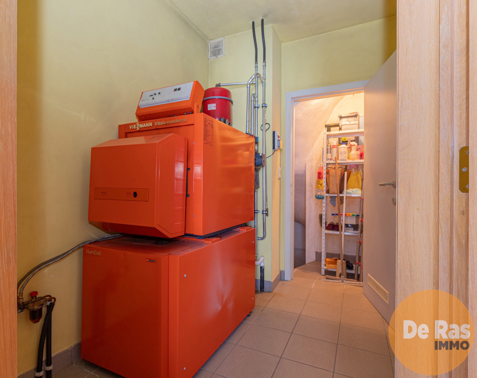 Op het gelijkvloers is er een inkomhal met apart toilet, ruime woonkamer met inbouwkachel en een afgescheiden, goed ingerichte keuken. Naast de keuken een nuttige berging voor proviand en technische ruimte voor de zeer degelijke, kwalitatieve CV-ketel van Viessmann, waar ook toegang tot de kelder is.