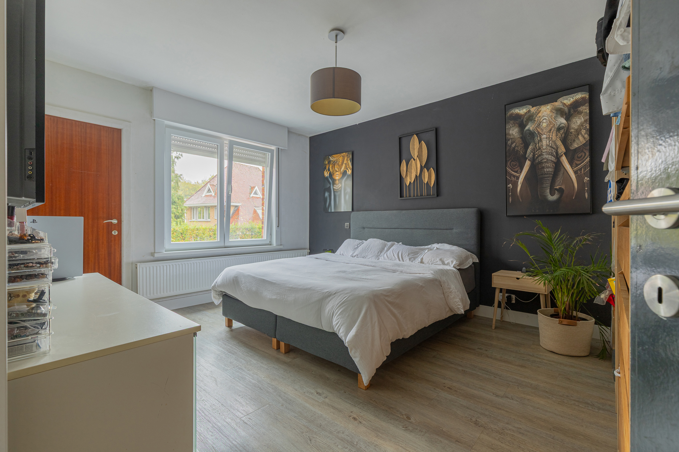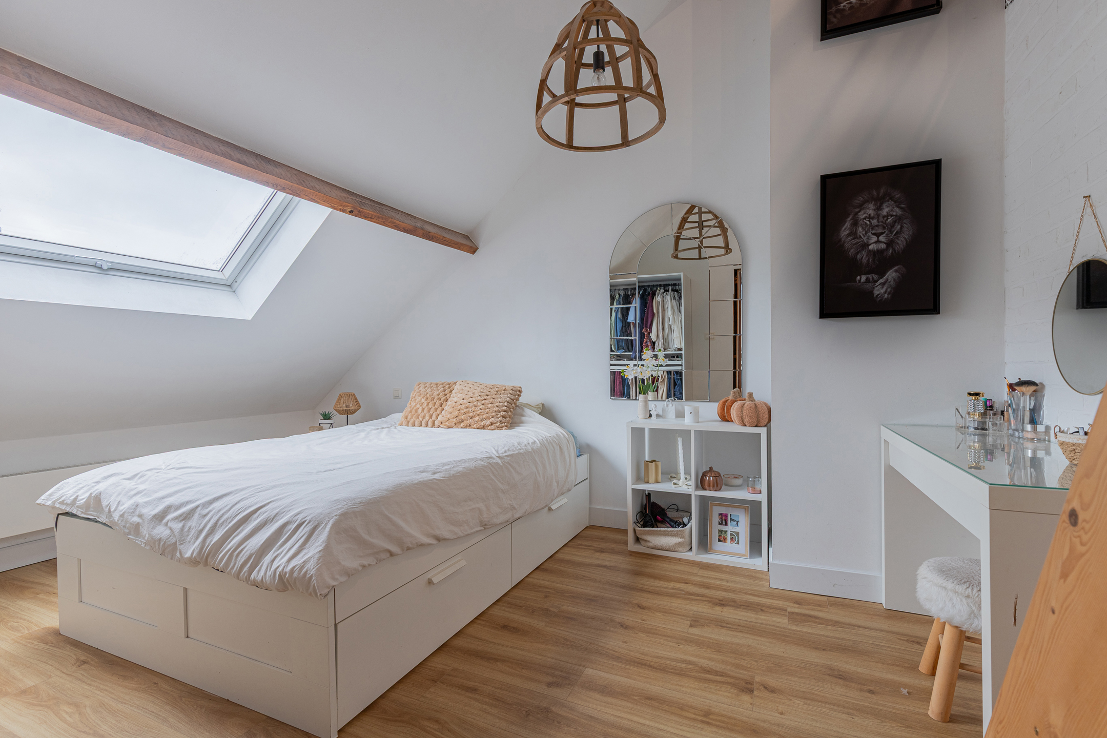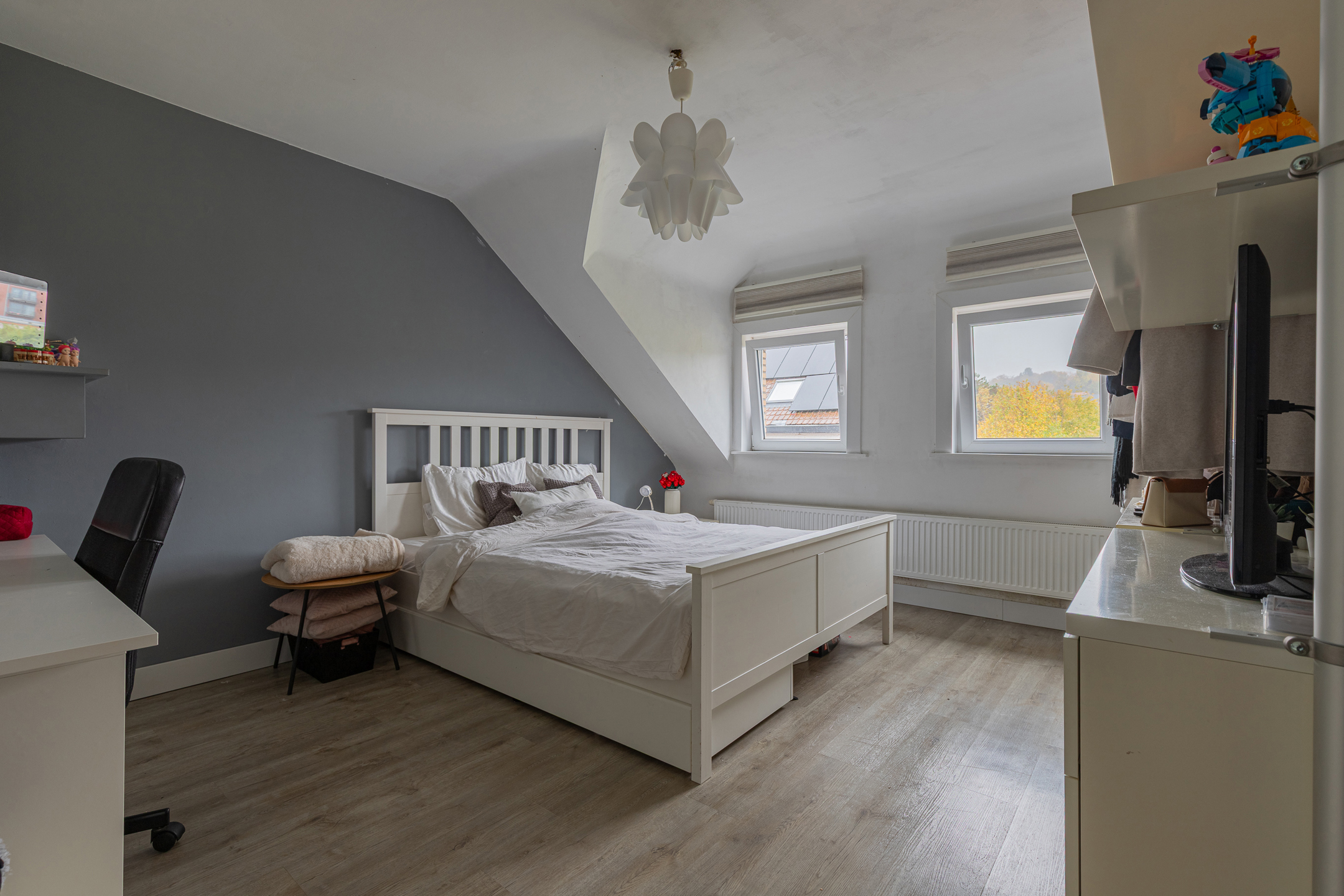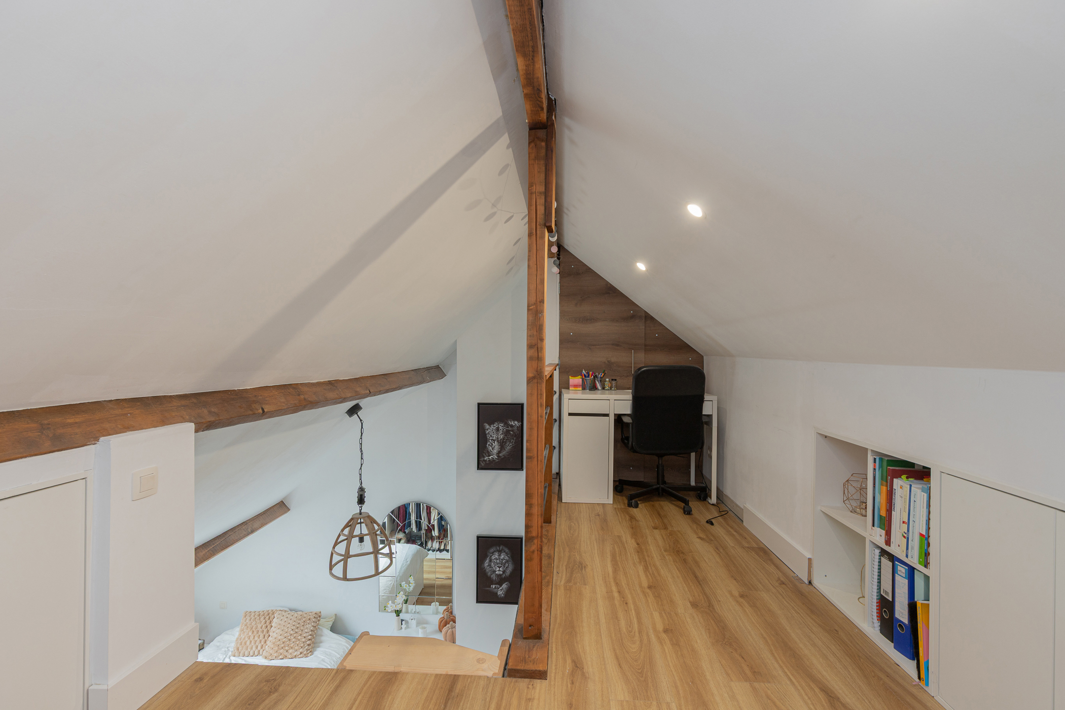 De zolderverdieping werd volledig afgewerkt en ingericht met twee ruime slaapkamers en een aparte bergruimte.