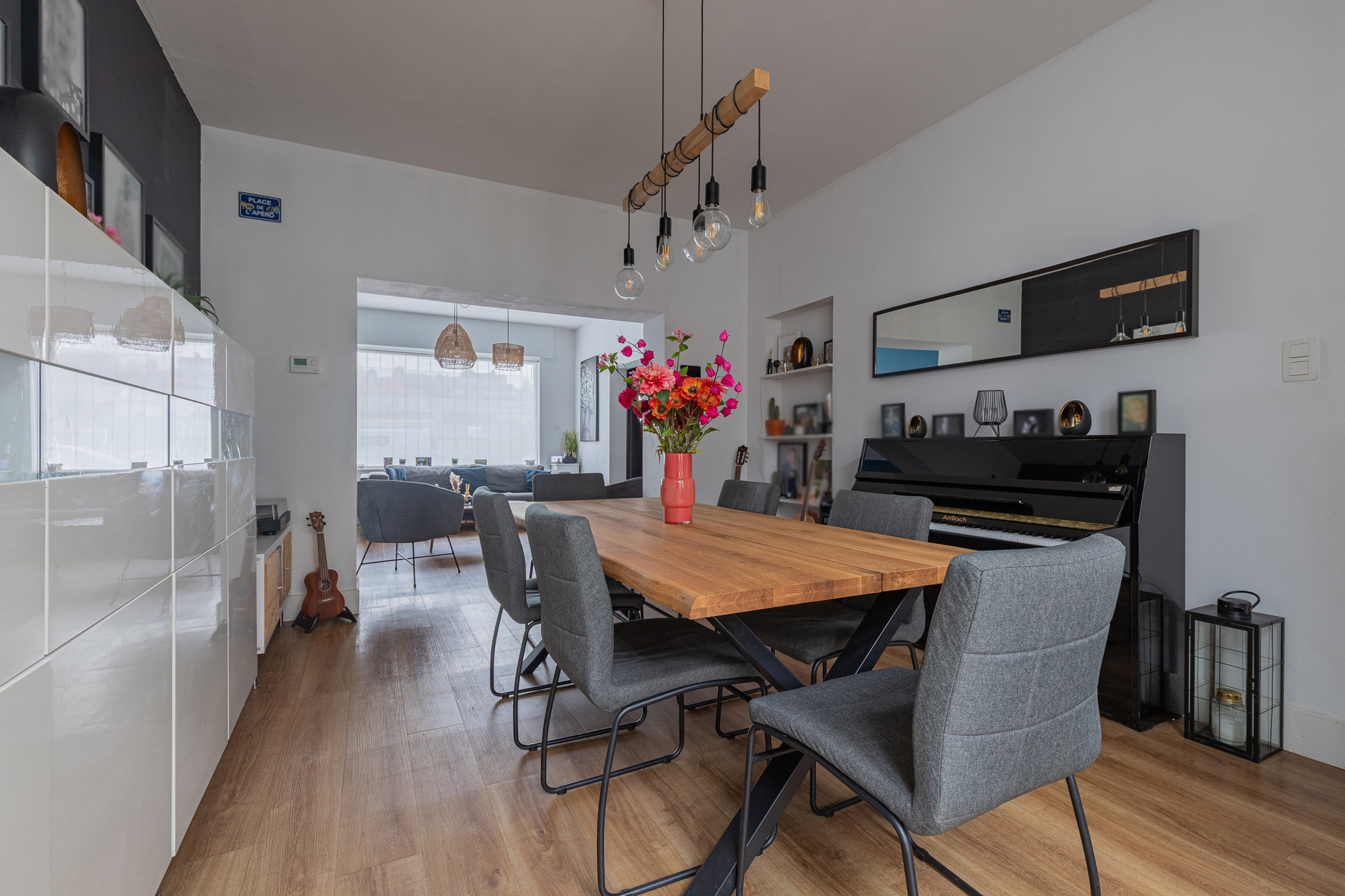 Naar indeling beschikt deze woning op het gelijkvloers over een aparte inkomhal, een zeer aangename en lichtrijke woonkamer, een ruime keukenruimte voorzien van een praktische keuken en een apart toilet.